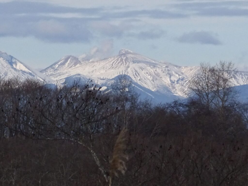 さらに歩を進めると、今度は北の方角に冠雪した阿寒の山々がくっきりと見え、道東地方が世界でも有数な活火山の密集地帯だということも説明しました。
