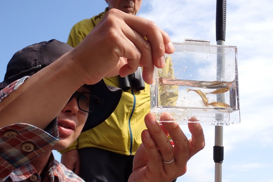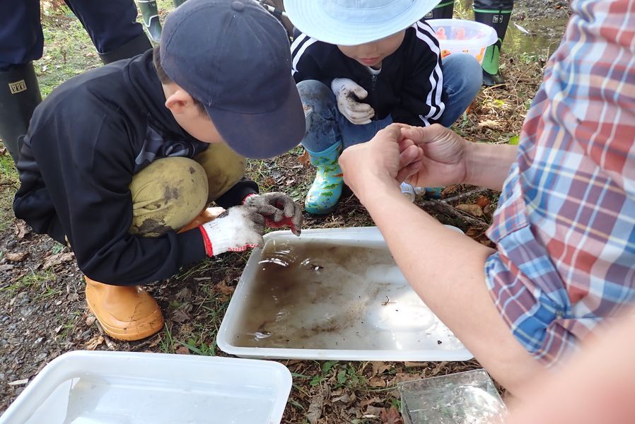 その後鶴居軌道跡へ向かい、遊歩道沿いの水辺を網ですくい上げたり、手で落ち葉を裏返したりしてザリガニを探したところ、小型の魚類であるエゾトミヨやエゾホトケドジョウが網にかかりました。