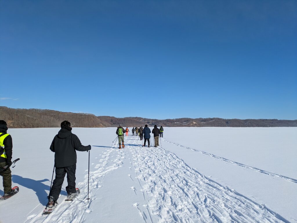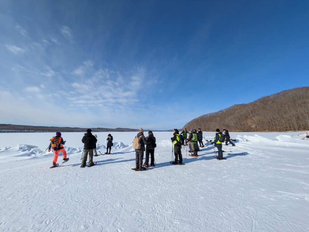 結氷した湖上に雪が少し積もっており、フカフカした感触を楽しみながら、厳冬期特有の景色である氷丘脈(御神渡り)やオオワシ、オジロワシを観察しました。皆さまスノーシューは初めてでしたがすぐに慣れたご様子で、それぞれ楽しんでいらっしゃる様子が印象的でした。
