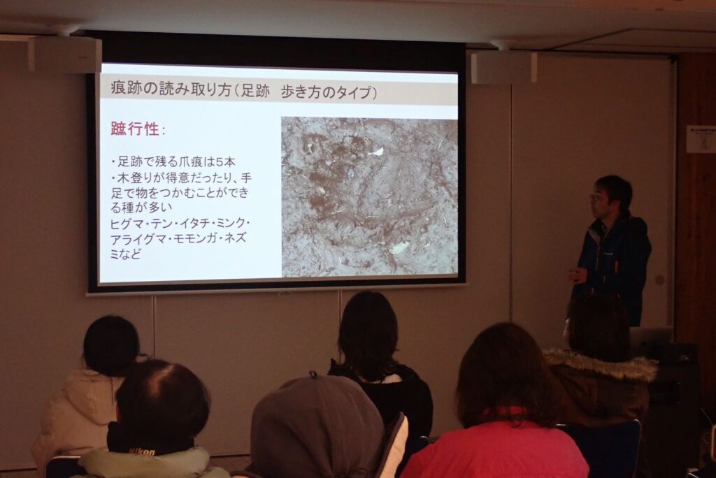 まずは、冬の動物たちの暮らしや、痕跡を見つけるコツを教えて頂きました。